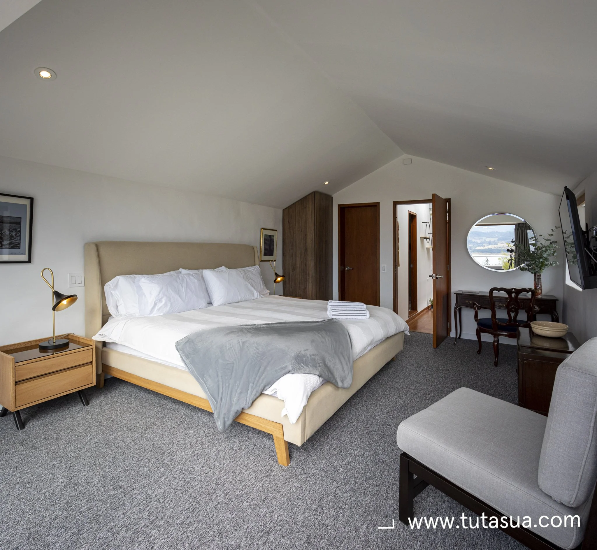 Walk upstairs to the two gorgeous and comfortable master bedrooms each with its own bathroom, view deck, 48” TV’s, reading chair and work desk. The Lake View one is all about the lake view. The Mountain View also has lake views and field views and a toddler size sun drenched wall mattress.