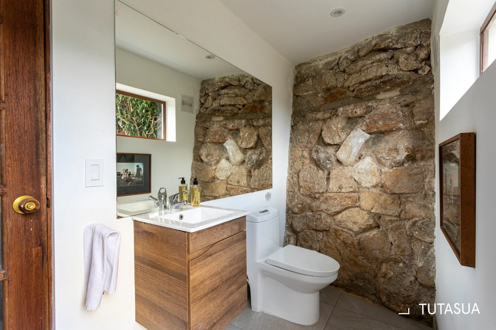 The cozy family room has a 65” new tv, high end sound bar, blue tooth turntable, dvdr. At the far left end is a door to the calm central rock patio, the exit to the laundry/dryer and place for your outdoor gear/bikes, and the guest bathroom, (if a pet is authorized these two rooms are the only where they are allowed). At the far end the stairs leading to the second floor.